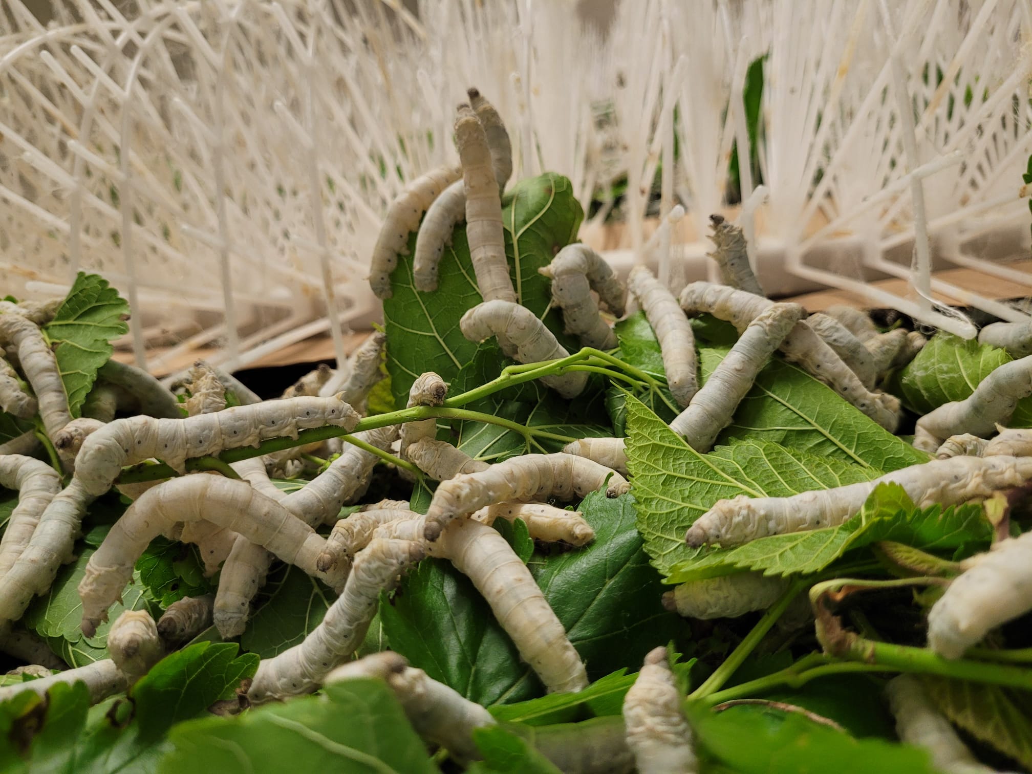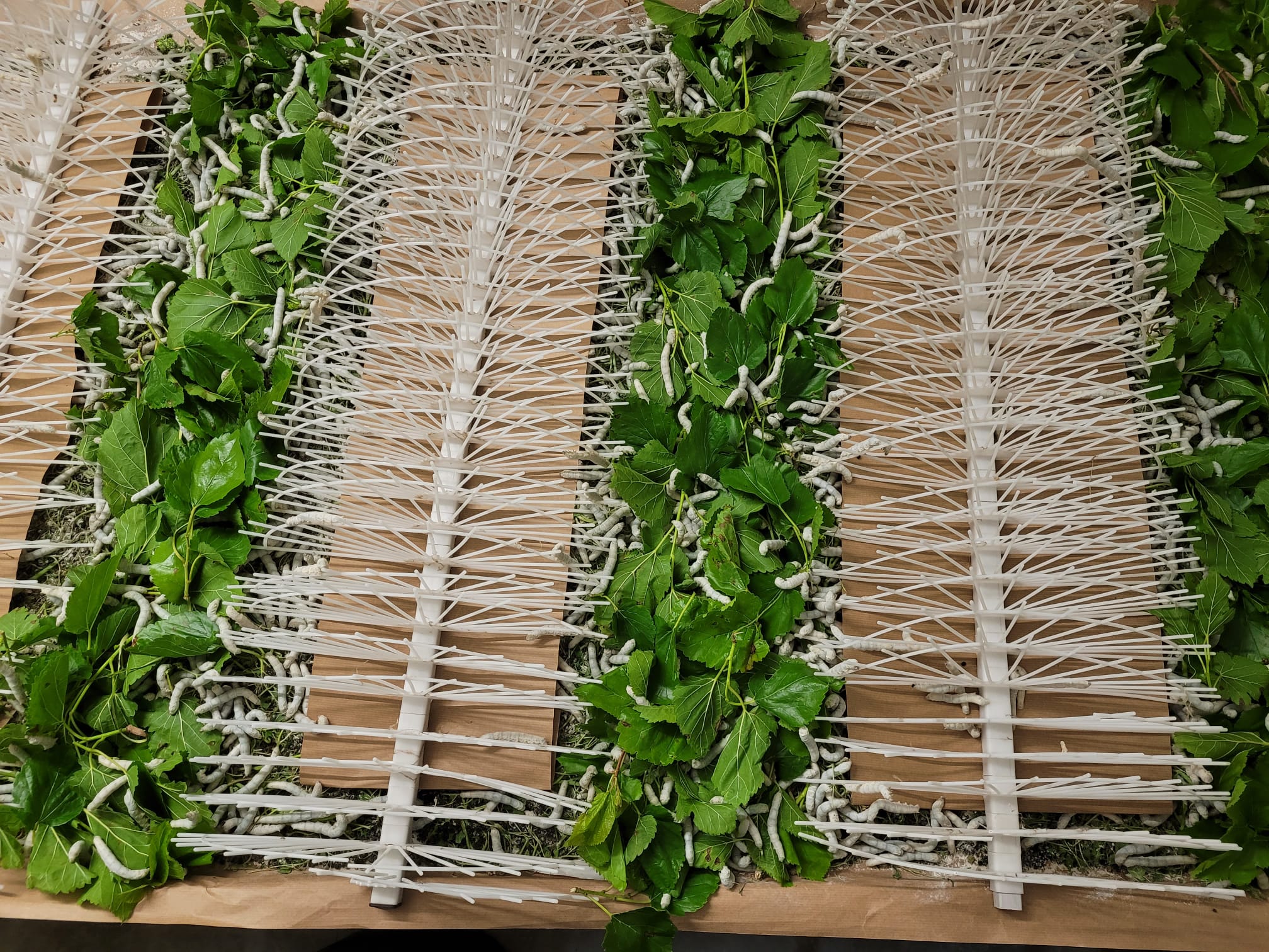 Mais la soie ne peut exister sans son compagnon végétal indispensable : le mûrier. Nos vers à soie sont nourris exclusivement de feuilles de mûriers issus de cultures biologiques chez notre producteur des Cévennes. Ces parcelles sont cultivées sans pesticides ni intrants chimiques, garantissant une alimentation saine aux vers et une production de soie exempte de résidus nocifs.