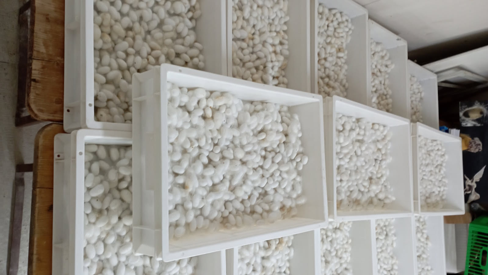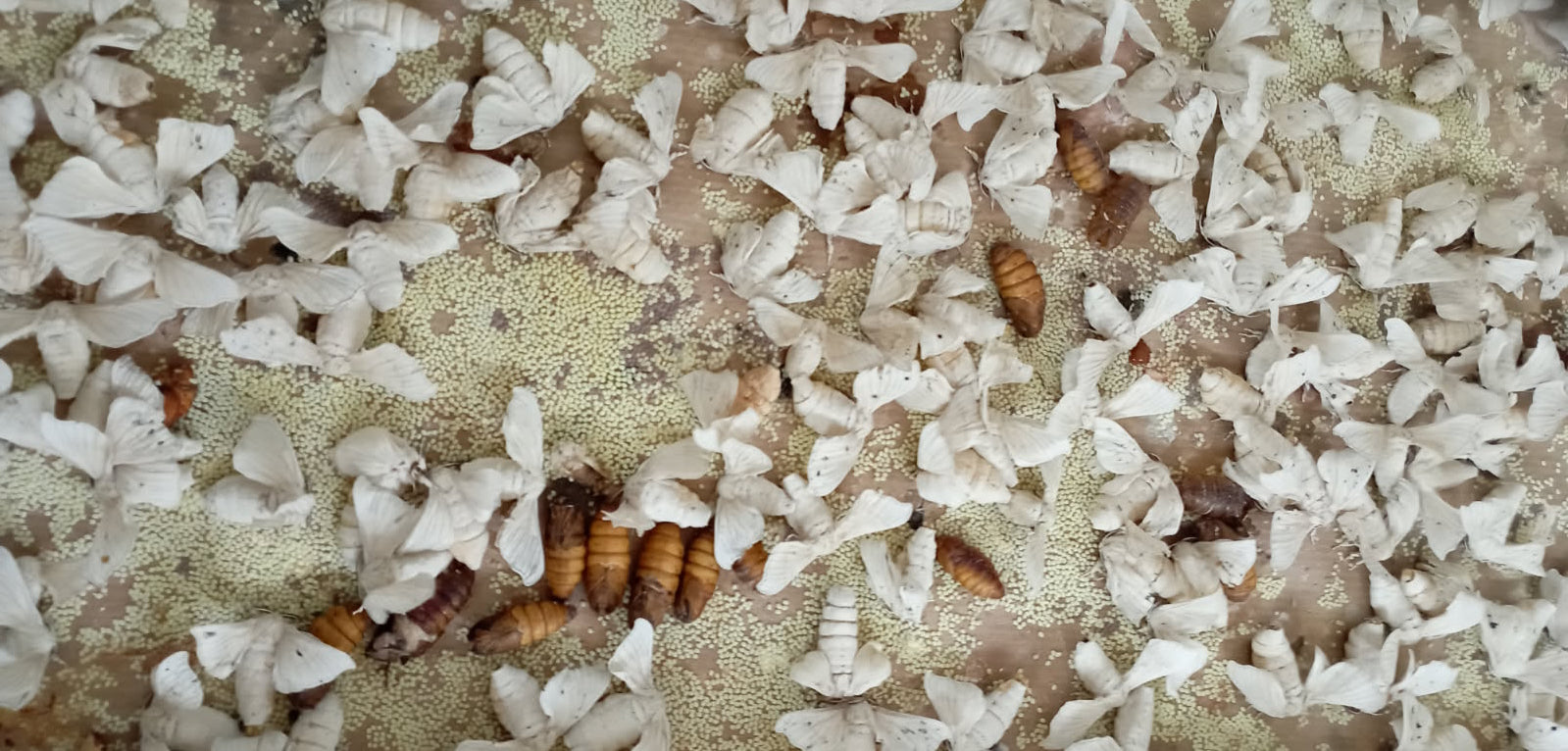 Le Bombyx mori, aussi appelé ver à soie, est un papillon domestiqué depuis des millénaires pour sa précieuse fibre. Traditionnellement, en sériciculture, les cocons sont ébouillantés avec la chrysalide vivante à l’intérieur afin d’extraire un fil continu de soie. Chez nous, la démarche est tout autre : nous laissons les chrysalides éclore naturellement. Une fois sortis de leur cocon, les papillons sont séparés afin de réguler leur reproduction et terminent paisiblement leur cycle de vie. Ce n’est qu’après leur éclosion que nous récupérons les cocons, préservant ainsi l’intégrité du vivant tout en bénéficiant des incroyables propriétés de la soie pour la peau.