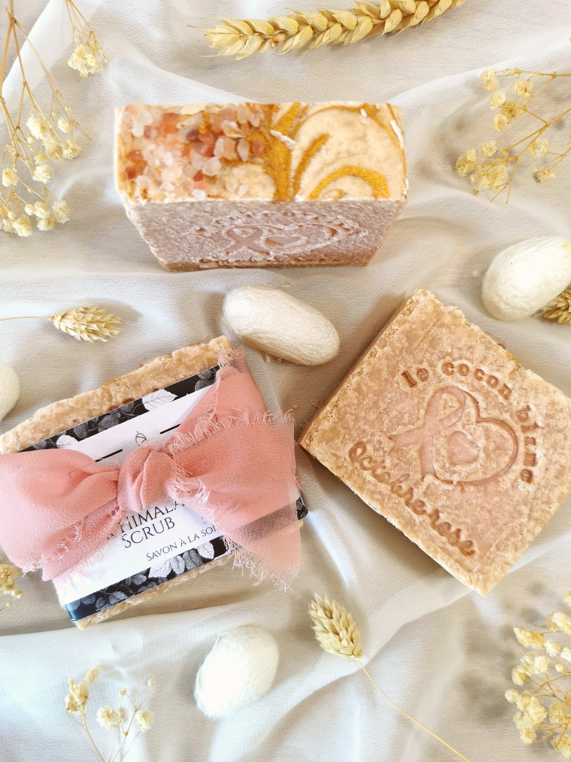 Ingrédients : Huile d’olive*, huile de coco*, huile de tournesol*, sel rose d’Himalaya, beurre de karité*, beurre de cacao*, huile de ricin*, cocons de soie, parfum, colorant naturel d’origine minérale.